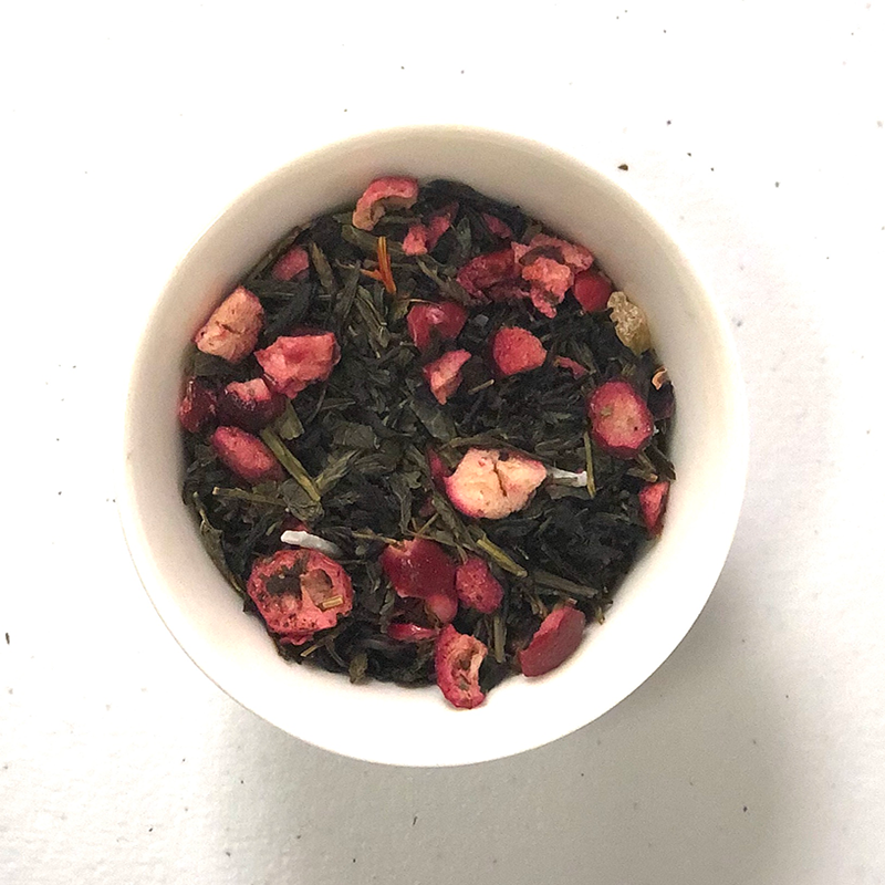 INGREDIENTS: green tea, black tea, cranberry pieces (sugar, cranberry, rice powder, vegetable oil), safflower petals, rose petals, pineapple bits (sugar cane (Thailand), pineapples, citric acid (max 1%)), cran-raisins (cranberries, sugar, cherry juice from concentrate, citric acid, natural cherry flavor with other natural flavors, elderberry juice concentrate, sunflower oil), shredded coconut (coconut, sodium metabisulfite (retains whiteness), powdered sugar (sugar, corn starch), water, propylene glycol (preserves freshness), salt, cellulose gel), natural and artificial flavor. CONTAINS: tree nut (coconut).