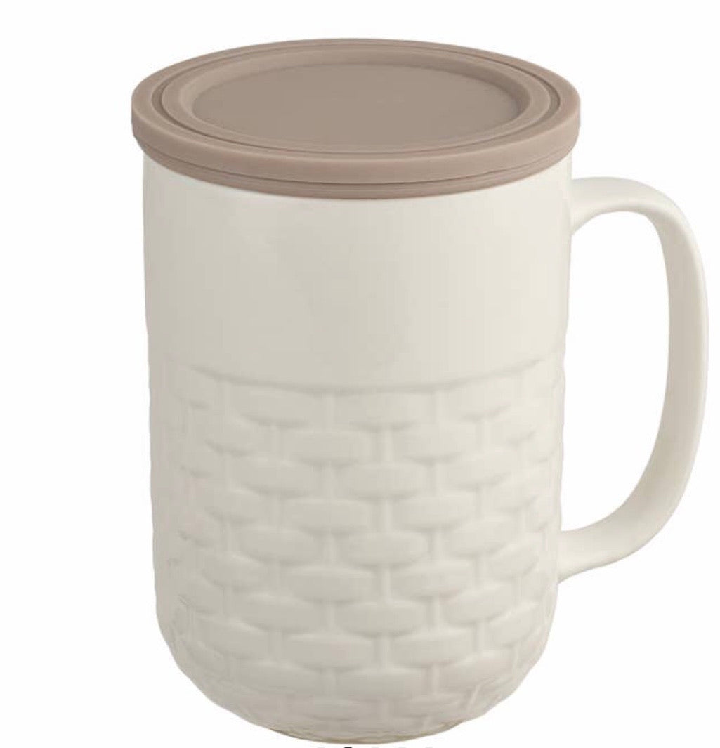 The 15 oz Weave tea infuser mug is made from new bone china. The exterior of the tea infuser mug features a basket weave textured design. The top part of the mug where you drink is smooth. The mug includes a stainless steel filter which is perfect for loose leaf tea. The mug has a comfortable handle and nice weight and feel. It is not too heavy. The handle does not get hot in microwave. The silicone lid is heat resistant to 450 degrees. The lid can be used as an infuser holder and coaster. The lid is not secure, so you cannot use as a travel mug. BPA free. Dishwasher safe. The mug and silicone lid are microwave safe. Do not microwave the stainless steel infuser.